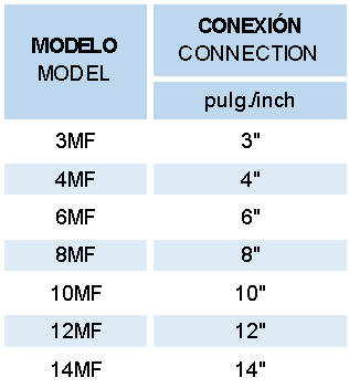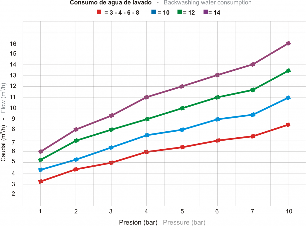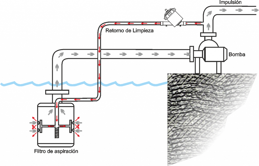Presión mínima de funcionamiento de la bomba 2,5 Kg/cm2. Caudal de retorno para la limpieza, modelos en varias pulgadas según el caudal.