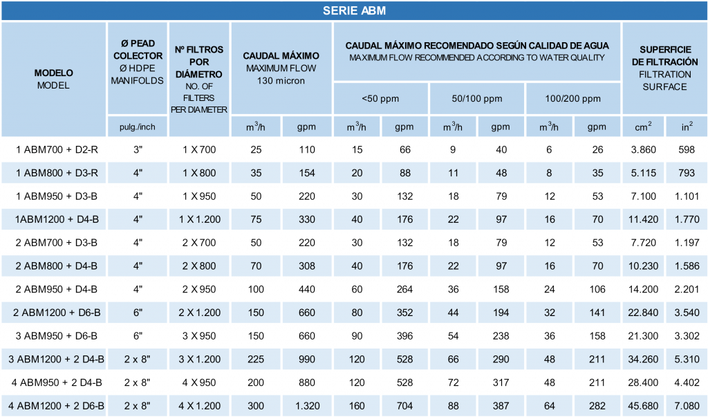 El caudal depende de la calidad del agua. Se suministra con colectores, válvulas, manómetros, ventosas, juntas, tornillos y arena sílice.