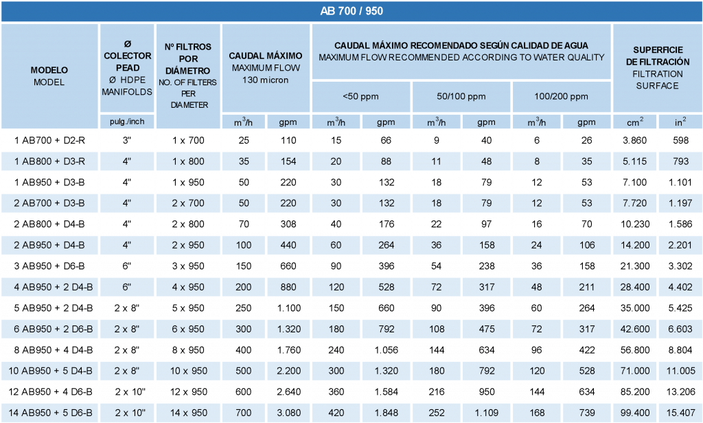 El caudal depende de la calidad del agua. Se suministra con colectores, válvulas, manómetros, ventosas, juntas, tornillos y arena sílice.