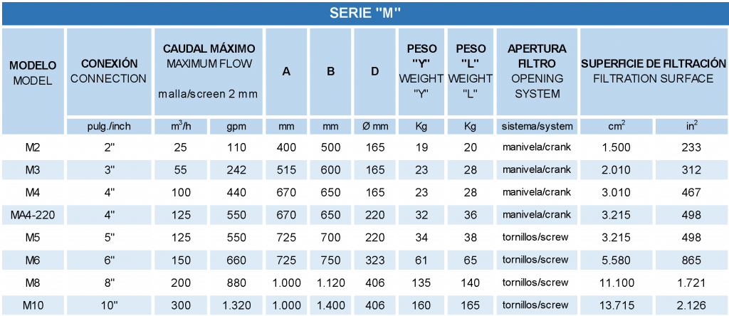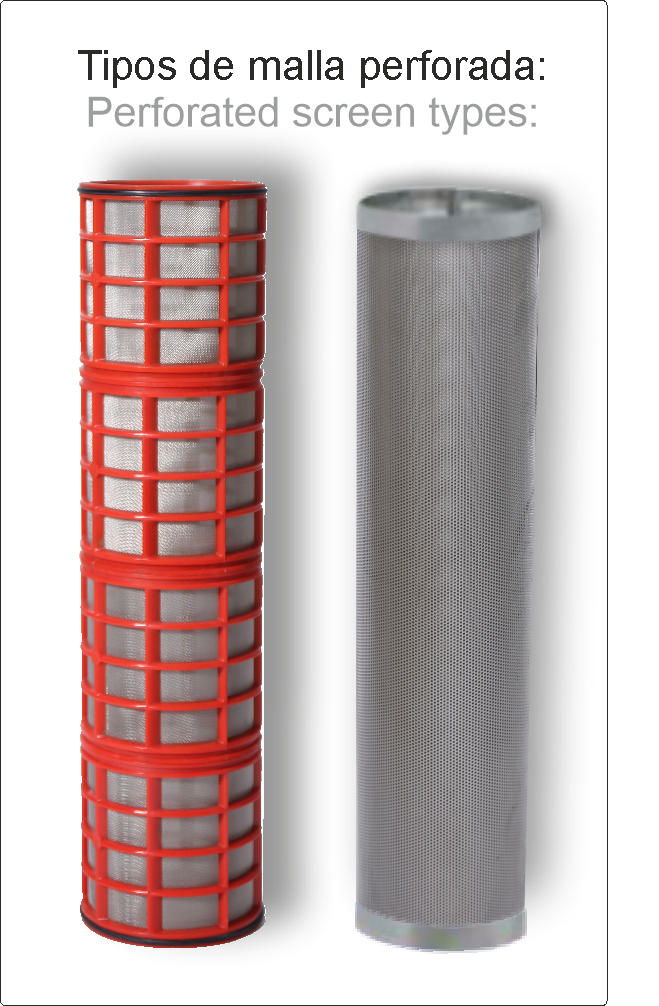 Filtración producida por la retención de partículas de mayor tamaño al hueco de la malla. Gran superficie de filtrado y facilidad de mantenimiento.