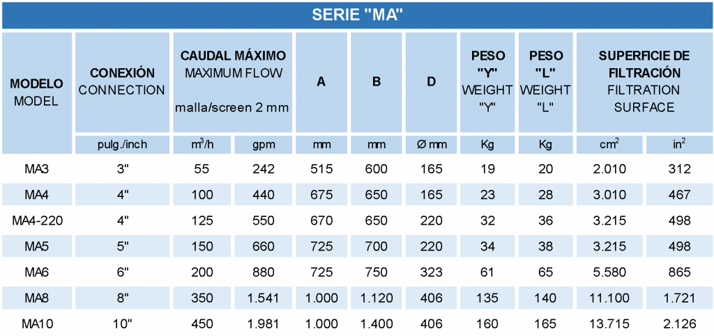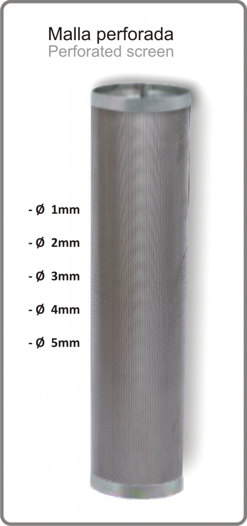 Filtración producida por la retención de partículas de mayor tamaño al hueco de la malla. Gran superficie de filtrado y facilidad de mantenimiento.