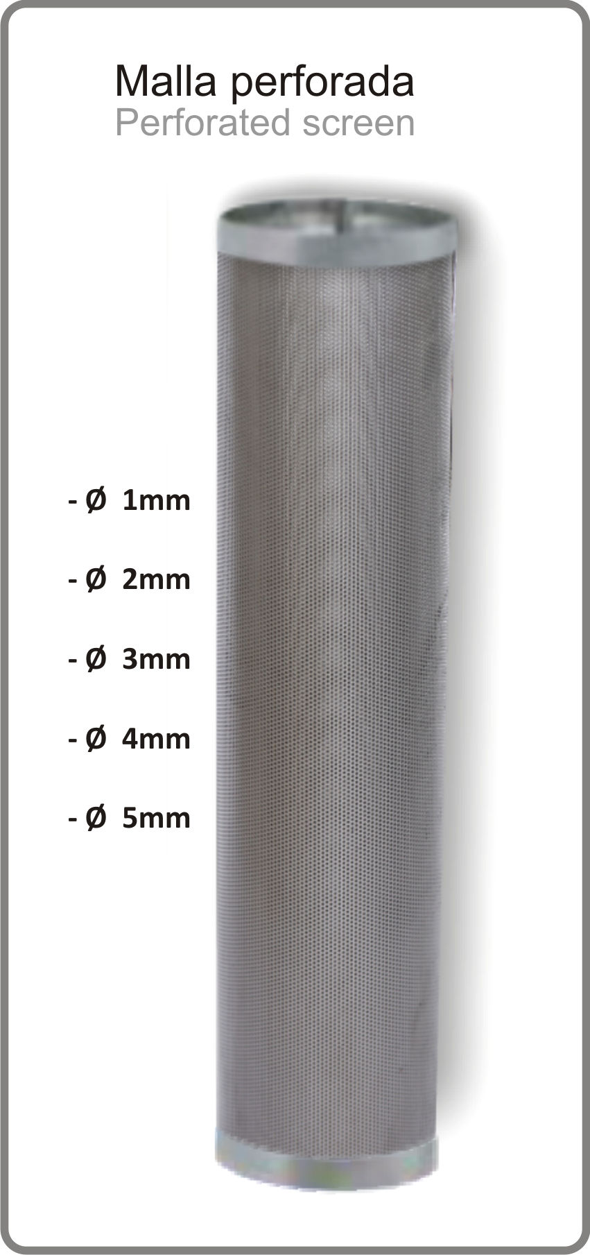 - Malla: acero-inoxidable AISI 316