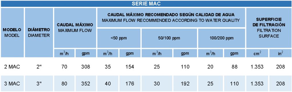 La Serie MAC es la incorporación más reciente de la familia de filtros automáticos de malla para la protección de los sistemas de riego. Es un filtro pequeño y liviano pero de alta resistencia, rápido y fácil de instalar y de operar, y necesita un mínimo mantenimiento. El MAC precisa de un bajo consumo de agua y energía. Tiene un diseño compacto y ocupa poco espacio.