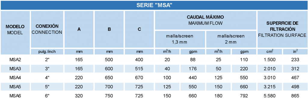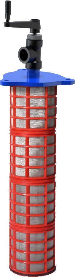 Filtración producida por la retención de partículas de mayor tamaño al hueco de la malla. Gran superficie de filtrado y facilidad de mantenimiento.