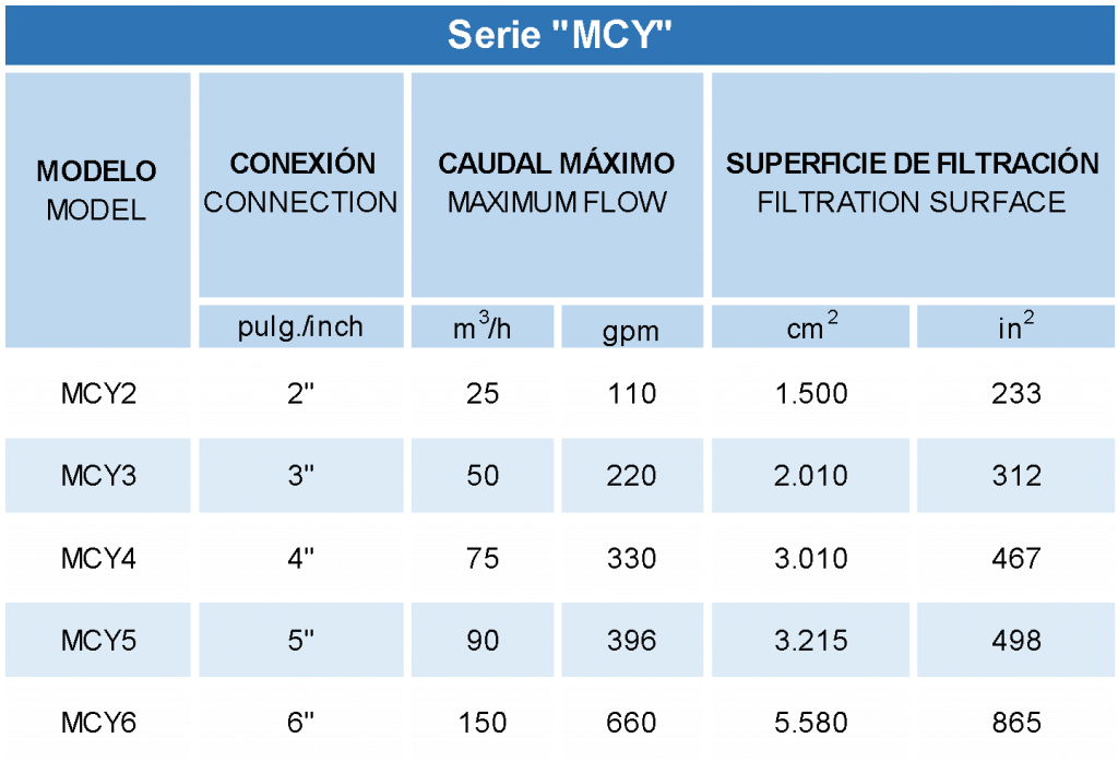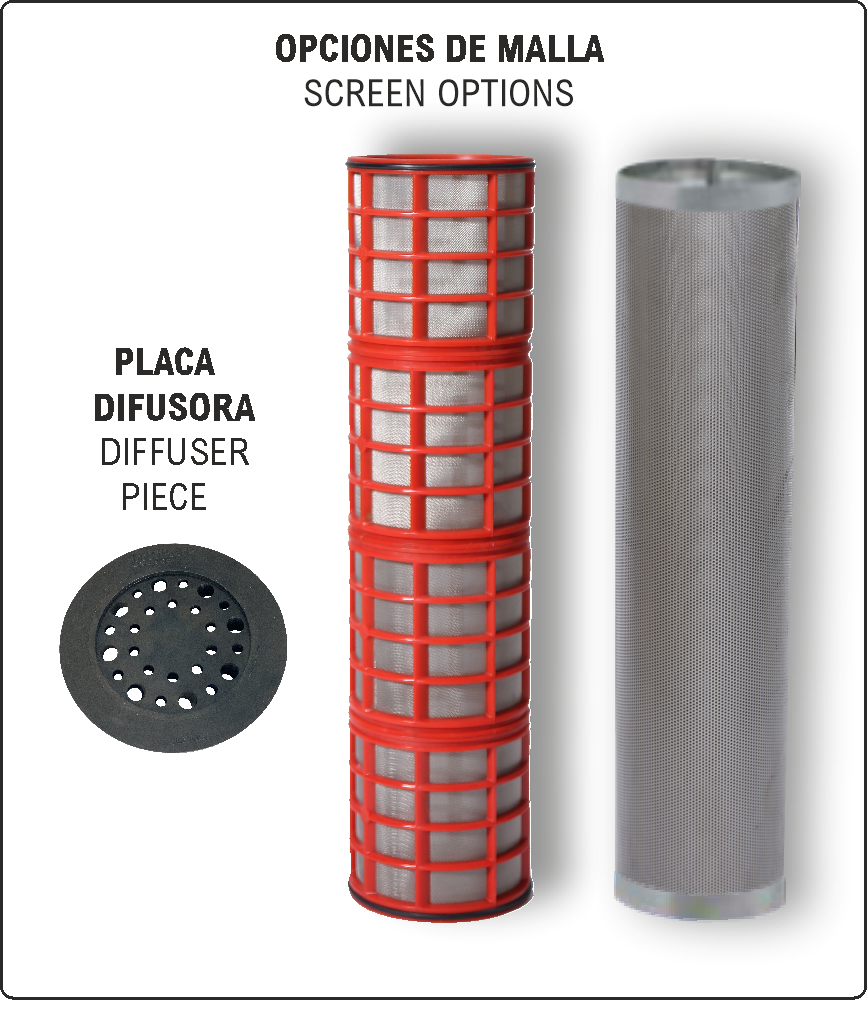 Filtración producida por la retención de partículas de mayor tamaño al hueco de la malla. Gran superficie de filtrado y facilidad de mantenimiento.